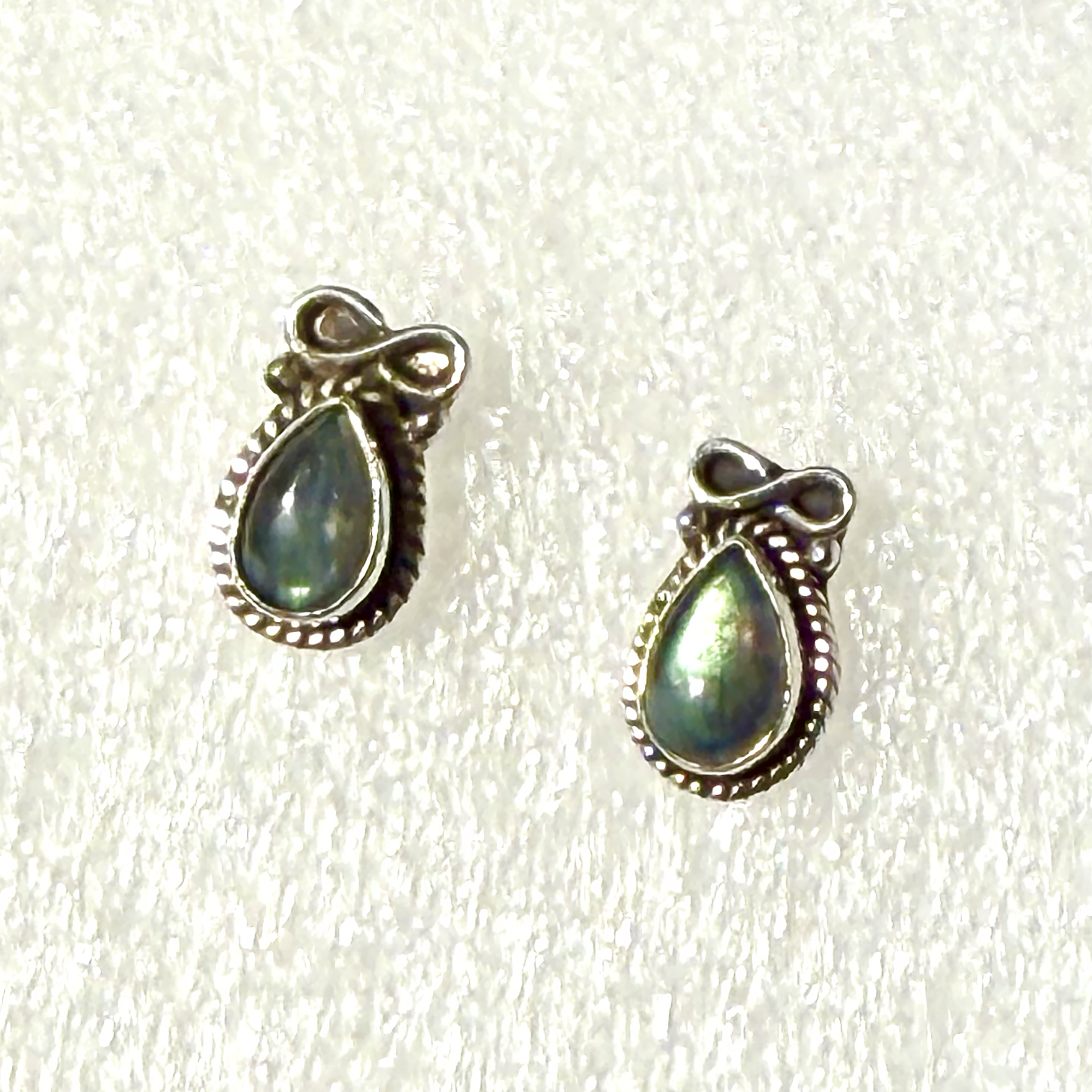 Beautiful quality 5.8mm wide at the widest point by 8mm long Labradorite teardrop stones in silver filigree earrings topped with a bow that looks like a lemniscate aka infinite symbol. The sterling silver setting is a rope around the Labradorite with post backings as seen in picture three.