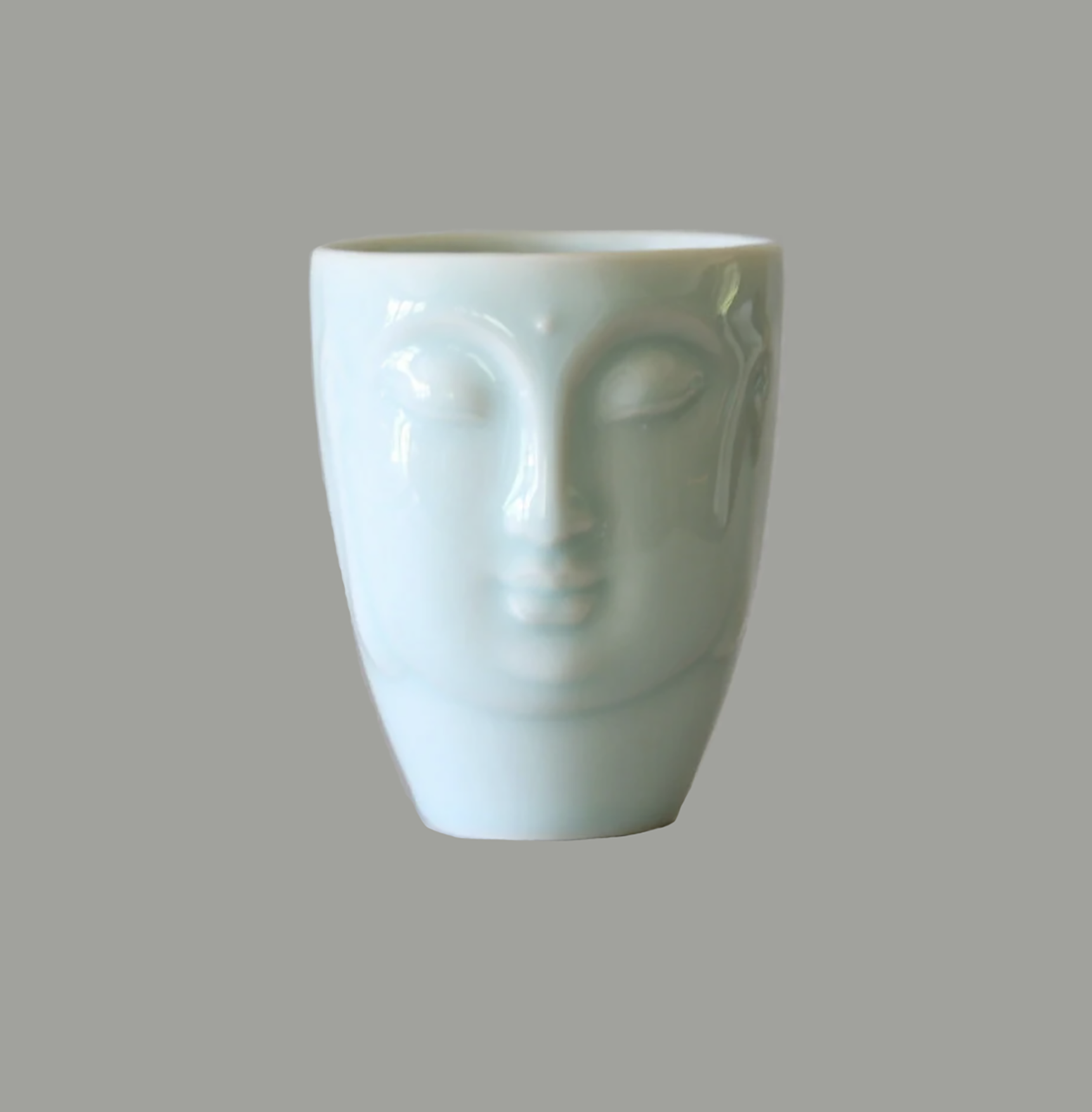 Lovely Asian-style, porcelain cup or mug glazed in gorgeous celadon green that also seems like celadon blue color hand-cast from hand-carved mold of Buddha relief art. This majestic cup measures 3.25 inches in diameter by 4 inches high. 8 ounce cup.